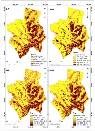 Visually, the mapping results of the boosted regression trees, support vector machines and logistic regression models had some similarities in terms of the spatial distribution of the probability of gully erosion occurrence in the area (Figure 6). Zones of high to very high erosion susceptibility mostly appeared in the eastern and southeastern parts, whereas those of very low susceptibility mostly occurred on the western side in the four resultant maps.