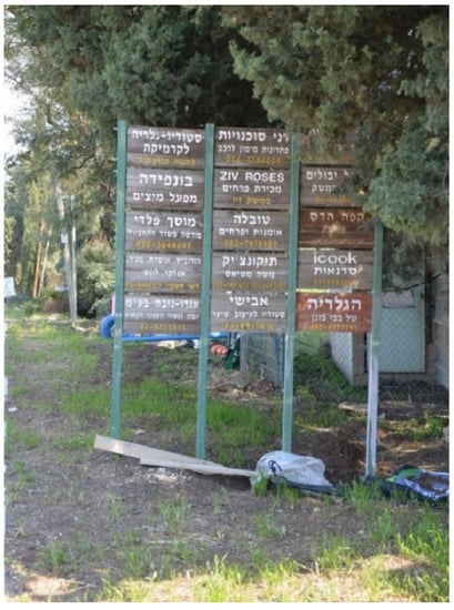 Non-agricultural businesses at Moshav HaYogev, including baking workshops, accountants, and a ceramic studio. The businesses are located on the family plots. Photo by the authors.