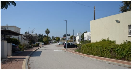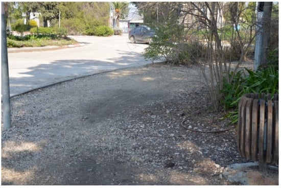Security and safety are major aspects in any future development. Studies that have examined the sense of security in the moshav space [27] suggest that it should be improved by morphological changes in the built environment and by ensuring a high level of maintenance. The safety of public space in the moshavs is far from optimal: often, sidewalks are missing (Figure 16), and those that exist are not well maintained. Public spaces in general suffer from a low quality of maintenance. In addition, to improve the sense of security, conditions must be created to increase the number of people in the public space, encouraging them to spend time in that space, and improve walkability. In order to do so, higher budgets must be invested in the maintenance of public space, and in changing its morphological characteristics.