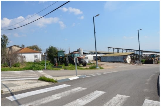 When examining the spatial quality obtained following the rural regeneration at the center of Nahalal, it appears that it is precisely its concentric configuration (criticized as too closed) and the ideal walking distances (800 m from the houses of all farmers to the very heart of the center) that enable reducing parking spaces and increasing walkability and access, the latter also improving the sense of security [29]. The wide lanes (the main roads and the peripheral road are 20 m wide) enable long sightlines to the open landscape from the driving/walking lanes to the entire moshav, as well as along the borders of the moshav’s estates (Figure 12). Finally, adding housing units at the center increases density, which, together with the mix of soft uses, creates a potential for optimal performance.