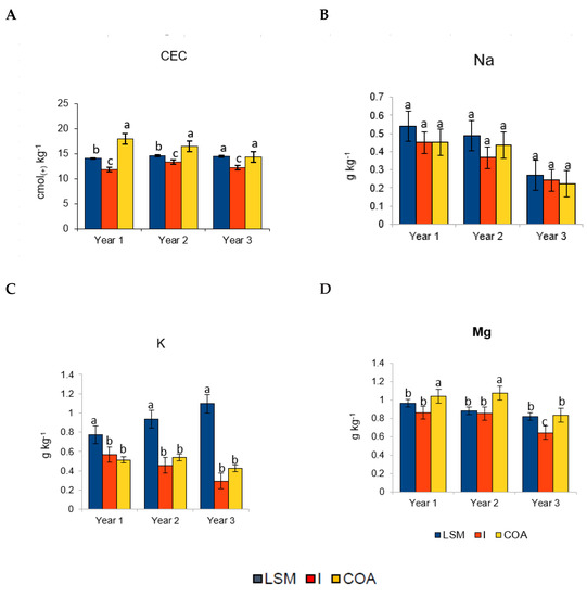 Figure 4D) increased in the three treatments throughout the study period, especially in the LSM and COA where a statistically significant increase was observed over the three years, while in the I it only appeared between the first and second years and remained constant between this and the third year. Despite these trends, the values were very similar in the three treatments and, at a significance level of 0.05, lacked statistical significance (Χ