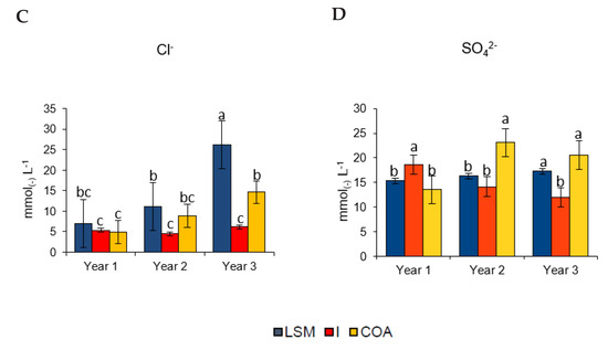 Figure 3D) such that it increased in the LSM and COA throughout the experiment, while in the control (I) it decreased from the second year onwards. The differences between the treatments were not as contrasted as in the case of Cl