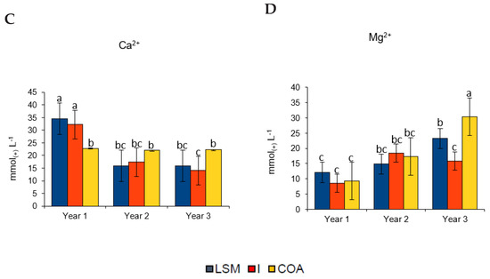 2+ concentration in the soil solution was the maximum in the first year of the trial in the LSM and I, after which a decrease was observed, which stabilized in the third year; however, in the COA it remained stable over the 3 years (