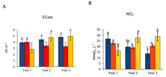 Figure 3. Evolution of the ECext (A), and NO3, Cl, and SO42− in the soil solution, (BD) figures, respectively. a–c Significant differences at 95%.