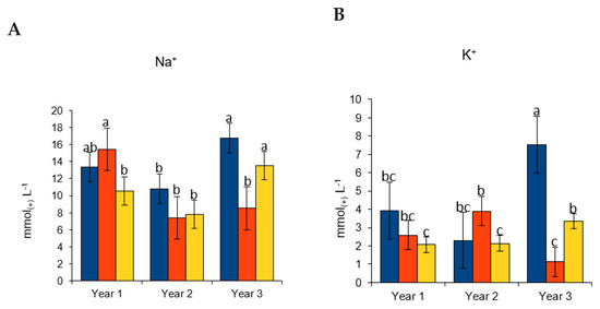 Figure 4. Evolution of the Na+, K+, Ca2+, and Mg2+ in the soil solution, (AD) figures, respectively. a–c Significant differences at 95%.