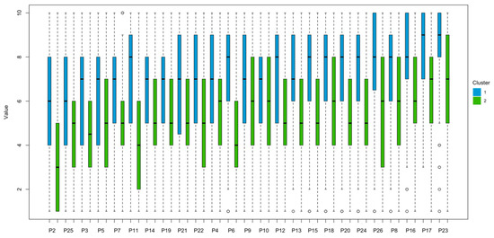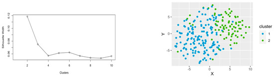 The partial dissimilarity d(i,j) (f) depends on the type of variable that we are measuring. In the case of numerical variables, partial dissimilarity is the ratio between the absolute differences between observations and the maximum observed range of all individuals. In the case of categorical variables, the partial dissimilarity is 1 if the observations are different and 0 if not. The selected clustering algorithm should fit well with the Gower distance. To do this, we selected the k-medoids algorithm. The k-medoid algorithm, Partitioning Around Medoids (PAM), is a classic partitioning method similar to the well-known k-means method but, instead of iterating over the centroids, it iterates over the medoids, that is, it tries to find the most representative object for each cluster [46]. The algorithm clusters the objects in a total of k clusters, where k must be given a priori. The selection of the optimal number of clusters (k) must be made considering statistical information obtained in the data, although if there is any reasoned justification a priori, the number of clusters may vary for different reasons. To select the optimal number of clusters into which to divide our data, we use the silhouette width. The silhouette width is one of the most commonly used options for measuring the similarity between each point in a cluster and compares this similarity with the closest point of the neighboring cluster. This metric lies between (−1, 1) where higher values mean greater similarities. Figure 1 shows the result of the measurement for values of k between 2 and 10, where it can be observed that segmenting the students into 2 groups maximizes the similarity within the clusters and the dissimilarity between clusters. We have divided the sample into 2 groups following the results found in the silhouette analysis; however, using k = 2 produces useful results for grouping respondents. We use this approach to segment the respondents, leaving question P32 out of the analysis, which is that which defines the size of the city in which the respondent lives. In the following section we present the findings of the survey.
