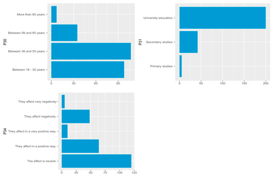In terms of the size of the city, there were 13.98% with fewer than 20,000 inhabitants, 7.34% with between 20,000 and 50,000 inhabitants, 20.62% with between 50,000 and 250,000 inhabitants, 23.07% with between 250,000 inhabitants and 1 million and 34.97% with more than 1 million inhabitants. As indicated in Figure 2, the majority of participants were between 35 and 55 years old (37.5%), followed by participants between 18 and 35 years old (34%). Most respondents had a university educational level (70%), with some of with secondary studies (24%) and a few with primary studies (6%). When asking respondents about their opinion on the effect that tourist housing rental platforms have on their environment, the majority of respondents suggested that the effect is neutral (43%), followed by a positive effect (24%). Only 8% of respondents claimed that tourism affected their environment very positively. A few respondents suggested that tourism affected their environment negatively (20%) and very negatively (5%) (see Figure 2 for details).