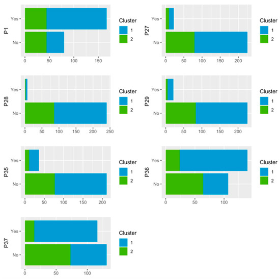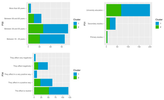 For a better visualization of our results, we represent the variables in which we find differences between clusters, that can be considered as the main discriminatory variables between the two clusters in Figure 5, Figure 6 and Figure 7. As seen in Figure 5, the vast majority of respondents have used the services of tourist accommodation platforms such as Airbnb, Wimdu, 9flats, Roomorama, Onefinestay, HouseTrip, FlipKey, CouchSurfing, and MisterAirbnb. Moreover, the vast majority of respondents did not have a touristic apartment or own a company that benefits from touristic activities (see Figure 5).