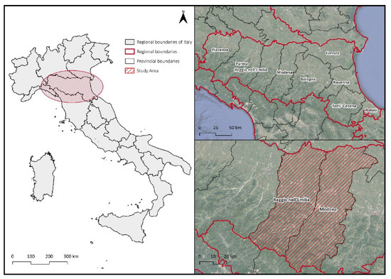 The area of interest covers the entire provinces of Modena and Reggio nell’Emilia (Figure 1), which extend over an area of just under 5000 km2 (about 25% of the regional territory, larger than that of the Molise region), involving 89 municipalities out of a total of 330. The average size of the analyzed municipalities is 56 km2, which is larger than the national average (38 km2). Data from the 2021 ISTAT census show that over 1,200,000 inhabitants (30% of the regional total) live in this area, with a population density above the national average of 250 inhabitants/sq km. In the last ten years, the resident population has increased by about 30,000, most in the two provincial capital municipalities and those of Carpi, Vignola, and Castelfranco Emilia, with active balances of over 1000 new residents. From an economic point of view, the Emilia-Romagna region ranks third in terms of average total IRPEF income (the tax year 2020 MEF data), and even in the municipalities of the surveyed area, the per capita income is higher than the national average value, except for the municipalities in the southern part, located in the inland areas along the Apennines. This region, according to Eurostat for the two-year period 2019/2020, is in eighth place in Europe for industrial value added. Specifically, the two studied provinces, according to Istat data, for 2020 have a per-capita industrial value added of EUR 32,400 for the Province of Modena and EUR 31,700 for the province of Reggio nell’Emilia, respectively in seventh and ninth place among all the Italian provinces. Data processed by ISPRA on national soil consumption show that the Emilia-Romagna region is one of the Italian regions with the highest percentage of consumed soil (the third after Lombardy and Veneto with over 200,000 hectares by 2021) with an annual increase recorded between 2020 and 2021 of just under 6 km2. In this context, the investigated provinces are among the most urbanized at the regional level with percentages of consumed soil exceeding 11% of the total and those in which the most soil has been consumed in the last year.