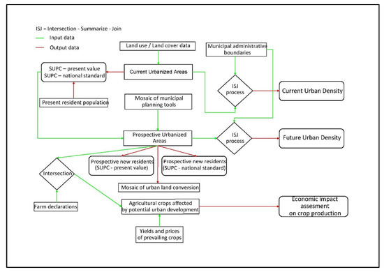 Data on land consumption comes from the ISPRA portal (Istituto Superiore per la Protezione e la Ricerca Ambientale). Values for agricultural yield come from the SIAN (Sistema Informativo Agricolo Nazionale) and price value comes from ISMEA (Istituto di Servizi per il Mercato Agricolo Alimentare) (http://www.ismeamercati.it/datiagroalimentare/indice-prezzi (accessed on 27 October 2022)). The values for the period 2015–2020 related to the crop types present in Emilia-Romagna were considered for the economic estimate of the agricultural loss. Yield values are expressed in 100 kg per hectare, prices in euros per 100 kg [11]. An analysis on the impact of transformative scenarios on agricultural production has been elaborated in GIS environment whose procedure is reported in the workflow of Figure 2. The CLC legend does not provide information about the type of cultivation present on the ground, for this reason the data of the Regional Agency, updated to 2021, for the distributions in agriculture are analyzed (https://agrea.regione.emilia-romagna.it/come-fare-per/open-data (accessed on 27 October 2022)). The data is partial (it covers 25% of the agricultural areas of the provinces), but it has allowed us to know the prevailing crops in the area and to build scenarios. In this way, yields and prices were associated, obtaining a result in euros per hectare. This is a purely economic estimate and does not correspond to the biophysical value of the service of agricultural production however conditioned by the uncertainty of yields and average prices that have been considered. The economic assessment is provided as a support, to understand the size of the environmental impact expected from the implementation of the transformation forecasts of municipal urban plans [12].