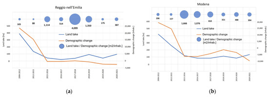 The joint analysis of the demographic dynamics and those related to land consumption has shown how the latter is substantially detached from the demographic dynamics (Figure 3). The fluctuations in the curve of the soil consumed are always positive, even in the presence of demographic decreases, reaching a maximum value of 4100 m2/inhabit for 2017–2018 period in Modena province and 1600 m2/inhabit for 2015–2016 period in Reggio nell’Emilia province.