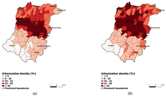 The trend of land consumption, as also witnessed by ISPRA [8], is declining, but is still far from stopping. It should also be noted that the surveyed area in the same year suffered a decline in population of over 6000 inhabitants. The above data derive from transformative actions already carried out and which have already transformed the natural soil in an irreversible way. The knowledge of the transformative forecasts present in the current plans has allowed us to outline the scenario that could derive from their complete implementation. Currently in the investigated area, there are about 750 km2 of urbanized area, most of which in the municipalities of the Province of Modena (430 km2) with a density of urbanization over the entire area of about 15%. As shown in Figure 4a, the highest values of urbanization density are concentrated along the central axis of the area studied and in the municipalities that are in the territories between the two centers and adjacent to them. In contrast, densities of urbanization (UD) are lower in the Apennine regions (UD below 5%). The framework of transformative forecasts, deriving from the summation of all the transformations that each municipality has foreseen in its plan but not yet implemented, emerges clearly from the reading of the PTM. In the study area, the municipalities plan to transform for urban purposes an additional surface of 110 km2, equally distributed between the two provinces. The full implementation of these forecasts would bring the area to a value of UD of 17%, more than 2 points more than the current condition (Figure 4b). The functional typology that affects the most is that for services (both public and private) (Table 2).