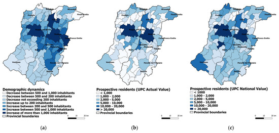 (a) Real demographic dynamics; (b) potential new possible residents according to the current value of SUPC; (c) potential new possible residents according to the value of standard SUPC.