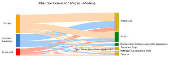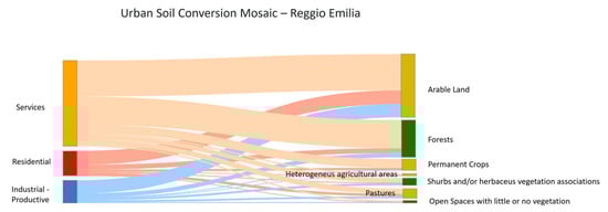 In both analyzed cases, the macro-category of services appears to be the most impacting on natural soil (2486 ha for the province of Modena and 3716 ha for the province of Reggio Emilia). In absolute terms, the most affected soil categories are arable land and forests (Table 3).