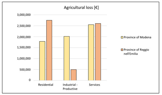 The economic loss due to agricultural production resulting from the possible implementation of the municipal urban planning plans with the hypothesis that all categories of land use at level IV are occupied by the prevailing crop, is more than 12 million euros per year. For the province of Modena, the loss is greater (6,350,000 EUR/year). In this case, the macro-category of services causes the greatest economic loss (over 2.5 M EUR/year), followed by that of services (2.0 M EUR/year) and residential areas (1.8 M EUR/year) The result for the province of Reggio nell’Emilia is different. The total hypothetical loss amounts to 5,850,000 euros per year. In this case, residential areas suffer the greatest economic loss (2.7 M EUR/year), compared to a loss of services equal to 2.6 M EUR/year. In this case, the agricultural loss destined to industrial zones—productive is relatively low (about 500,000 EUR/year) (Figure 8).