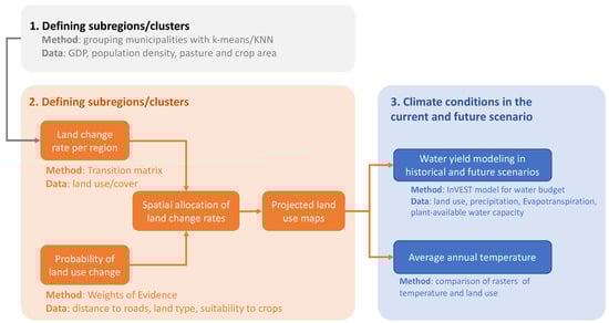 Our analytical framework combines land change modeling and ecosystem service (water yield) estimates for historical (1980–2010) and projected (2016–2046) scenarios of land use and climate conditions. First, we regionalize our analysis by defining clusters of municipalities with similar socioeconomic conditions (i.e., GDP and population density) to calculate the rates of land change for each sub-region. Second, we simulate future land use by allocating land change rates using the weight of evidence (WoE) method in the Dinamica EGO software [27]. Third, we used the InVEST software [28] to estimate changes in water yield distribution under current and future climate scenarios. We compare current and future temperature envelopes for agricultural areas and the impacts on water production. As seen in Figure 2, our analytical framework is based on Silva’s approach [29]. The following sections will provide details on the datasets used and the modeling approach for each step.