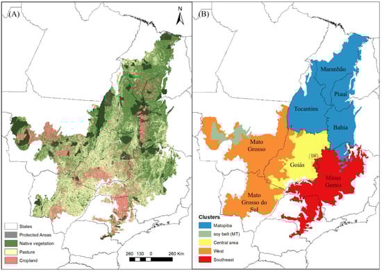Figure 3. Cerrado land use (2016) on the left, and subregions for land modeling on the right side. Source: (A) Mapbiomas [3] and Brazil [26], and (B) the author’s analysis.