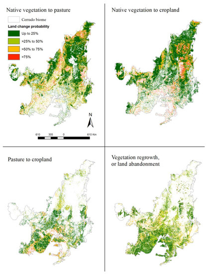 Our land change model’s results are in agreement with other recent studies. For instance, our projected land change rates are consistent with those found by Monteiro et al. [53], who estimated 302 thousand km2 of new agricultural areas between 2012 and 2050. Strassburg et al. [19] also projected similar results, with ~202 thousand km2 of land change in a business-as-usual scenario for the period of 2012 to 2050. Furthermore, Ferreira et al. [54] and Lima et al. [55] found the same critical regions at risk of vegetation loss in the northern (Matopiba) and western (Mato Grosso) parts of the Cerrado. However, our approach is different in a few aspects; for instance, we considered competing land uses between pasture and crops and the regrowth of secondary vegetation. Strassburg et al. [19] mention the importance of regrowth/restoration, and our work captures this dynamic explicitly in the model as a transition between land uses.