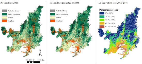 Figure 5. (A) Land use (2016), (B) land change simulation (2046) within the Cerrado, and (C) projected vegetation loss (2016–2046) at the municipal level. Source: Mapbiomas and the author’s analysis in Dinamica EGO.