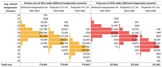 Figure 6. Distribution of agricultural area (km2) on current and projected land use and average temperature. Source: LCM and TerraClimate temperature projections.