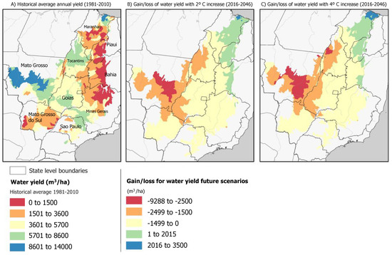 The combination of farmland expansion and higher temperatures will result in an adverse scenario for the water balance of crops. Currently, Mato Grosso state has the highest historical water yield in the study area (Figure 7) due to the higher rainfall levels that characterize this part of the Cerrado just south of the Amazon. Our results, however, indicated that a scenario of a 2 °C increase in temperature will affect this region the most. We estimate that new agricultural land will expand in areas with severely reduced water availability, particularly in Mato Grosso. According to our model, most land clearing (581,000 km2) will occur in places with reduced water production (up to −1500 m3/ha per year), and some of these areas are already vulnerable to drought, such as those along the eastern part of the biome (i.e., the states of Minas Gerais and Bahia).