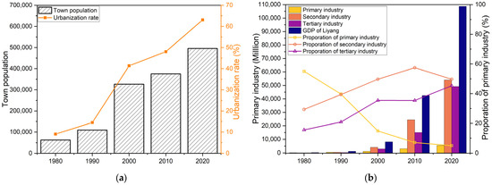 Development of Liyang from 1980 to 2020. (a) Urbanization process; (b) Industry development process.