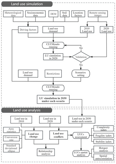 Figure 3 illustrates the overall research structure. The study area’s land use in 2030 was projected using the CLUMondo model under various scenarios. The ecological risk assessment model was used to evaluate the LUCs in the region from 2010 to 2030. Some spatial analysis approaches, such as standard deviational ellipse and hot spot analysis, were used to quantitatively describe land use features. Based on these analyses, strategies for land management and planning were proposed.