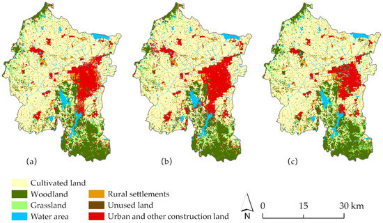 Results of land use simulation in 2030 under different scenarios. (a) NGS; (b) EDS; (c) EPS.