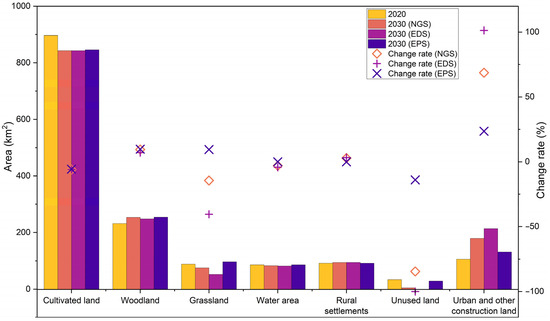 The spatial distributions of the land use simulation for 2030 are shown in Figure 5. The land use areas and change rate are shown in Figure 6. The area conversion graphs of each land use type under the defined scenarios are shown in Figure 7. Generally, the water area and rural settlements changed slightly under the three scenarios. Significant changes occurred in the cultivated land, grassland, unused land, and urban and other construction land. In all scenarios, there was a large decrease in cultivated and unused land, while urban and other construction land increased significantly.