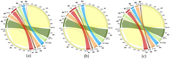 Land use conversion area chord diagrams. (a) NGS; (b) EDS; and (c) EPS. A1–A7 are the land use types in 2020; B1–B7 are the land use types in 2030; 1–7 represent cultivated land, woodland, grassland, waters, rural settlements, unused land, and urban and other construction land.