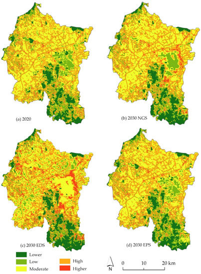 Table 6 shows the quantitative changes in land use conversion from 2020 to 2030 at each level of LUCs under different scenarios. The total areas of land use conversion were 239.36 km2 under the EDS, 203.98 km2 under the NGS, and 118.14 km2 under the EPS. The conversion area in the high and higher levels was 68.21% in the EDS, while this was 46.07% in the NGS and 12.87% in the EPS. As noted in Section 3.2, the average conflict index for the EDS was 0.508, which was higher than the values for the other two scenarios, 0.500 for the NGS and 0.498 for the EPS. This indicates that the degree of land use conversion was closely related to the intensity of land use conflict. Overall, the more land use conversion that occurred in the region, the more intense the land use conflict was.