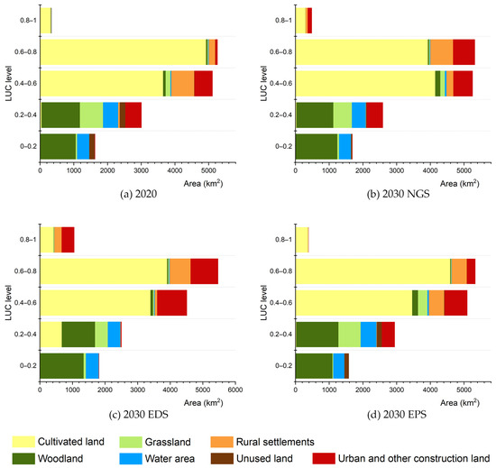 Figure 9 illustrates the area of each land use type in the different levels of land use conflict. In 2020 and 2030, more than 90% of both the woodland and water area occupied the low and lower LUC levels, indicating that these two land use types were in a stable state. Apart from its absence under the EDS, the unused land remained in the low and lower LUC levels in both 2020 and 2030. Over 90% of the grassland occupied the low and moderate LUC levels, except for under the EDS, where it was around 80%. The areas of these two types of land were small in size within the study area, so even if their changes were significant, they did not have a great impact on the LUCs. More than 90% of the cultivated land was distributed in the moderate and above LUC levels, with more than 50% being distributed in the high and higher levels, indicating that the cultivated land was highly variable. The distribution of built-up land varied greatly across the different LUC levels. In 2020, 74% of the rural settlements occupied the moderate LUC level. By 2030, more than 50% were in the high and higher LUC levels in all scenarios, with more than 90% occupying these levels under the EDS. The urban and other construction land accounted for only about 6% of the high and higher LUC levels in 2020, while it increased in 2030 to 42% under the NGS, 58.85% under the EDS, and 19.42% under the EPS.