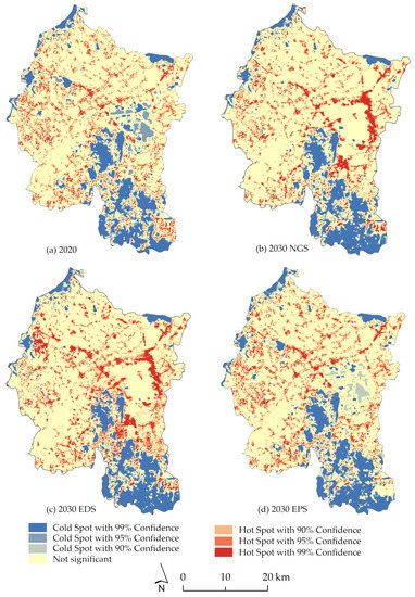 The global spatial autocorrelation test was performed for the LUCs in 2020 and 2030, as shown in Table 3. The p-values were all less than 0.01, and the z-scores were all greater than 2.58, indicating that the results of the spatial autocorrelation confidence test were reliable, i.e., the conflict levels of the different spatial units were not randomly distributed. The value of Moran’s I was 0.76 in 2020 and increased to more than 0.8 in 2030, indicating that the clustering of LUCs will increase in the future and that the EDS recorded the strongest clustering effect among the three scenarios. The calculation results of the local index of spatial autocorrelation (LISA) for the LUCs are shown in Figure 10. In 2020, hot spots were scattered in the study area, mainly along rivers and traffic arteries. In 2030, there were no major changes under the EPS. Under the NGS and EDS, there was an obvious belt-shaped hot spot aggregation area around the city center, and the original hot spot areas had all expanded. Compared to the EPS, there were also significant hotspot clustering areas on the northwest and south sides of the city under the EDS. The cold spots were clusters of low-level conflict, and these were mainly concentrated in large areas of water and woodland; the overall change from 2020 to 2030 was not significant. However, the cold spot areas within the city center had greatly reduced by 2030 and had almost disappeared under the NGS and EDS.