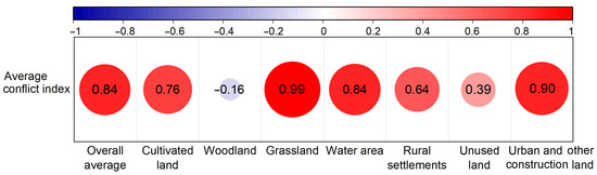 (3) The land use conflicts were found to be closely related to the land use change. In general, the more intensive the land conversions, the higher the land use conflicts. The Pearson correlation analysis showed that the average land use conflict index in the study area was significantly positively correlated with the overall average land use comprehensive dynamic degree. For each land use type, the correlation between the land use dynamics and the average land use conflict index was positive, except for the woodland.