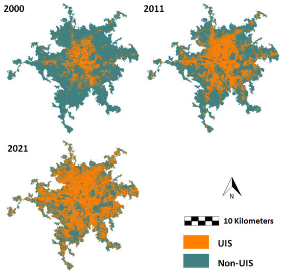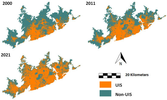 Annual UIS maps for Kumasi in 2000, 2011, and 2021 (upper left, upper right, and lower left), respectively.