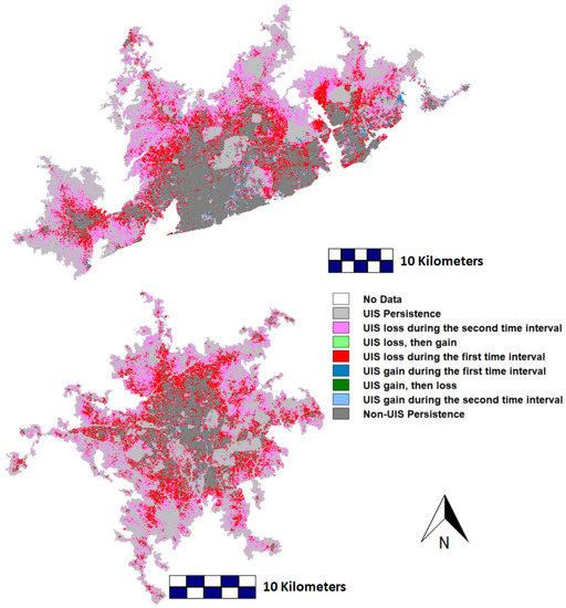 Bilintoh and Pontius, Jr. [23] developed methods and the binaryTimeSeries R package to analyze the trajectories of a binary variable during a time series. We employed their methods and the R package to analyze the trajectories of UIS in the two cities. Equations (2) and (3) show how to compute the gains and losses of the variable, considering its trajectories as a proportion of the product of the duration of time interval t, and the number of locations for the trajectory j. The size of the unified region (), which facilitates site comparison, is the union of all pixels that show the presence of the variable during temporal extent. annualizes the results. Equations (4) and (5) show how to compute the average loss and gain during the temporal extent. Then, Equations (6)–(9) compute the three components of change: quantity, allocation, and alternation. The quantity component measures the net change from the initial time point to the final time point of the time series. The allocation measures the simultaneous gain in some locations and the loss in other locations from the initial time point to the final time point of the series, which the net change does not reveal. Alternation occurs when a pixel experiences one or more pairs of loss and gain during the time series. Table 1 and Table 2 describe the trajectories and provide notations concerning Equations (1)–(11). Finally, Equation (10) shows how to compute the size of presence in the binary category at time t, while Equation (11) shows how to compute the annual net change proportion from time t − 1 to t in Equation (3). As [23] intimated, it is impossible to see trajectory types 3 and 4 for datasets with time points less than 4. Thus, our results reflect only six trajectories. The six trajectories are as follows: (1) loss without alternation, (2) gain without alternation, (3) all alternation loss first, (4) all alternation gain first, (5) stable presence, and (6) stable absence.