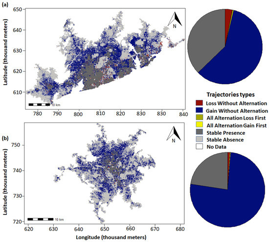 Figure 5a,b show the spatial distributions of the trajectories of change. Although the legend shows six trajectories, only four are visible on the map because of the relatively small number of pixels representing the two shades of yellow. Indeed, the pie charts show a slider in yellow, which is difficult to see. Table 3 and Table 4 show the number of pixels for each trajectory. Overall, the maps show that absence–gain–absence accounts for most of the change in both regions.