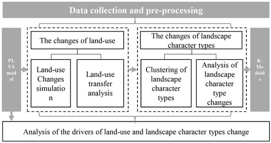 To achieve the study objectives, this study includes three steps: firstly, investigating and simulating the changes in land-use in the study area; secondly, identifying and analyzing the LCTs and their changes; and thirdly, exploring the driving factors behind these changes (Figure 2). The simulation and analysis of land-use changes are based on the PLUS model, while the LCTs are objectively classified with an unsupervised clustering approach by constructing an index system to enhance the cognitive understanding of the landscape in the study area.