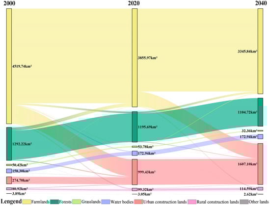 Sankey diagram for comparison of land-use dynamics in two-time intervals defined by three land-use maps for the years 2000, 2020 and 2040.