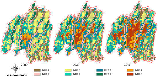 During the simulation for 2000–2040, the number and spatial distribution of the LCTs changed significantly (Figure 7). Table 6 shows that the samples of Types 1, 2, and 8 remain nearly unchanged from 2000 to 2020. The spatial distribution of Types 7 and 8, which are mainly urban construction land, shows an expansion from the densely built-up area to the suburbs. Type 7 is converted mainly to Type 8 (56%). Type 8 possesses a 100% non-conversion rate, although the number is low, with only 14 study units. Samples in Type 3, which are dominated by farmlands, are converted to Types 4, 5, and 7, mainly in regions with flatter terrain. Type 4, located in the hills, is changed to Type 5 by 23.51%, mainly in the southeast and southwest of the study area. Simultaneously, 24.62% of the samples in Type 5 (containing significant rural construction land) are converted to Type 7, distributed between densely built-up areas and suburbs. Compared to the other LCTs, the conversion rate from Type 6 to Types 2, 3, and 4 is essentially the same, accounting for 5–7%.