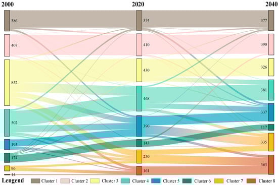 Compared with the period of 2000 to 2020, the primary difference between 2020 and 2040 is a 42.05% change from Type 5 to Type 7. No significant increase or decrease in the number of Types 3, 4, and 5 occurs, which is likely to be caused by the gradual reduction in the area of suitable land for building as construction land expands [] or the continued growth of the urban low-income population in the study area, most of whom cannot afford the housing loans located in the central city []. With economic development and capital accumulation, Types 7 and 8 have reached their ultimate capacity within the study area, and the rural population can purchase expensive housing in the central city, as evidenced by the decline in the number of Type 5 from 2020 to 2040.