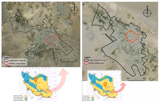Historic urban areas within the contemporary city of Kashan (left) and Yazd (right) [31].