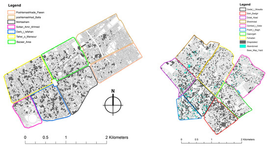 Consequently, two urban blocks were nominated in each selected tissue, which should have developed a higher and lower percentage of DABs per urban block, to capture the maximum variation of disused areas. The selection criteria were based on two logical aspects: (1) the reliable size of urban blocks (should have areas between 15,000 to 60,000 m2) and (2) the intaction quality of roads and physical structures, which can indicate public segregation, as a result of lack of vehicular accessibility. Consequently, twelve sample blocks were chosen for further investigation. Among all selected cases, six blocks are positioned in Kashan (B-1 and B-2 in Darb-i-Isfahan, B-15 and B-16 in Mohtasham, B-3 and B-5 Posht-i-Mashhad-i-paeen urban tissues), as calculated by Mirmiran [12] (Figure 6 (left)). Another six blocks are located in Yazd including Godal-i-Mosalla (B-30 and B-43), Dolat-Abad (B-9 and B-28), and Gonbad-i-sabz (B-8 and B-47) urban tissues, as measured by Behzadfar [11] (Figure 6 (right)).