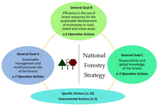 Scheme of the Italian National Forestry Strategy. Image inspired by the following source: https://www.politicheagricole.it/flex/cm/pages/ServeBLOB.php/L/IT/IDPagina/15339 (accessed on 26 April 2023).