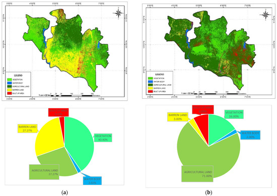 Changes in land use are a direct indication of ecological migration [38]. As seen in Table 5, Figure 2a,b and Appendix A, in Niger state between 1990 and 2020, the agricultural land experienced the largest increase with an annual rate of 7.44 units, while barren land and vegetation had the largest decrease of above 7 units each per year. There was also a slight increase in built-up areas and a slight decrease in water bodies. In Figure 3a,b and Appendix A, we can see that there was a drastic reduction in agricultural land and barren land in Kwara state between 1990 and 2020, while there was a reduction in vegetation, barren land, and water bodies. Benue state, as indicated in Figure 4a,b and Appendix A showed a similar LULC change like that of Kwara state, except that there was a marginal increase in the water bodies. This result indicated that Niger state has more tendency to cultivate crops than other two states due to the increase in agricultural land of the state. Furthermore, the increase in the built-up areas in these three states, especially in the cities, can be attributed to the migration of people from the rural areas to cities thereby, necessitating the need to meet the housing shortage and other basic amenities and infrastructure like transportation networks, roads and communication networks of the urban areas. In addition, several studies revealed that there has been a continuous conversion of other LULC classes to built-up areas in these three states in recent times, and this has been attributed to the increase in the rate of urbanization [24,35,39].