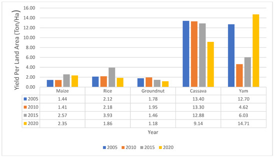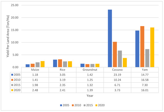 Crops yields and estimated cultivated landmass data of maize, yam, cassava, rice, and groundnut for 2005–2020 were extracted from National Reports on Wet Season Agricultural Performance in Nigeria published by National Agricultural Extension and Research Liaison Services (NAERLS), Ahmadu Bello University, Zaria, Kaduna State, Nigeria. These crops were selected because they are very common staple crops in North Central Region of Nigeria.