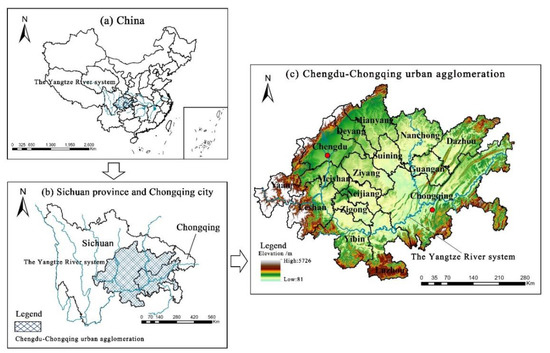 Previous studies have shown that scholars from different countries have used different terms to describe “urban agglomeration” at different stages of socioeconomic and human development. For instance, in the United Kingdom, “conurbation” is used. In the United States, it is called a “megalopolis” or “metropolitan area”. Similarly, in Australia, “urban centre” or “urban area” are used, and in Canada, terms such as “census metropolitan area” or “metropolitan region” are used [12]. “Urban agglomeration” is the official expression of China, and the United Nations Statistical Manual defines the term “urban agglomeration” in dense urban areas as follows: as comprising the city or town proper and also the suburban fringe or thickly settled territory lying outside, but adjacent to, its boundaries [13]. It is especially pointed out that urban agglomerations are different from administrative districts. Urban agglomerations may include several cities or towns and their peripheral areas. The expression clearly states that this area should include the central urban area of a city or town, the suburban fringe, or the immediate periphery. To sum up, despite the differences in terms of “urban agglomeration”, “conurbation”, “megalopolis”, “urban centre”, or “metropolitan region”, they all mean the same thing. In China, an urban agglomeration is the primary responsibility of the carbon neutrality goal. At present, there are a total of 19 urban agglomerations planned in China. Among these, the Yangtze River Delta (YRD), Pearl River Delta (PRD), Beijing–Tianjin–Hebei (BTH), the middle reaches of the Yangtze River (MRYR), and Chengdu–Chongqing urban agglomerations (the CCUA) are the five with the most vital comprehensive strength [14]. The five major urban agglomerations cover eastern China (YRD, PRD, and BTH), central China (MRYR), and western China (the CCUA), which are typical of China’s urban agglomerations. However, there are huge differences between the CCUA and other urban agglomerations: (1) The e urbanization level is low, and the internal development of the city is unbalanced. In 2020, the urbanization rate of the CCUA was only 62.4%, which was significantly lower than the other four urban agglomerations (81.1% in the PRD, 76.2% in the YRD, 68.2% in the BTH, and 63.6% in MRYR). In addition, the GDP of Chengdu and Chongqing, which only account for 31.30% of the area of the CCUA, accounts for 62.61% of the total GDP of the CCUA, showing unbalanced development within cities. (2) The intensity of territorial space development is low, and the ecological environment is complex and fragile. In 2016, the land development intensity of the YRD, PRD, and BTH was about 25%, the MRYR was about 11%, while the CCUA was only 9%, and the overall development intensity was low. In addition, the CCUA is located in an essential ecological security-guaranteed region of the upper reaches of the Yangtze River (URYR), which is greatly affected by human activities. Natural disasters such as earthquakes, debris flow, and soil erosion occur frequently, and the ecological environment carrying capacity is fragile. (3) There is a low level of economic development but rapid growth. In terms of total GDP, the total GDP of the CCUA was 6.64 trillion Yuan in 2020, which was 32.38%, 65.16%, 76.97%, and 70.69% that of the YRD, PRD, BTH, and the MRYR, respectively, ranking the last among the five major urban agglomerations. However, in terms of economic development speed, the CCUA had the second-highest annual GDP growth among the five urban agglomerations in the past two years (second to the MRYR), which is at the stage of rapid development. In conclusion, compared with the other four agglomerations, the CCUA still has some problems, such as a lower level of urbanization development, unbalanced internal urban development, lower intensity of territorial space development, complex and fragile ecological environment, and weak economic development strength. However, at the same time, the CCUA is also the most densely populated region with the most robust industrial foundation in the west of China. In 2021, the Chinese government promulgated the Planning Outline for the Construction of Chengdu–Chongqing Twin City Economic Circle (2021–2035), which further clarified that the CCUA would be built into an important economic center with national influence. In this context, in the next 15 years, the CCUA will experience a round of rapid urban expansion and land use structure change, often accompanied by the high-intensity use of land resources and the destruction of the environment. For one thing, traditional resource-based industries and heavy and chemical industries such as thermal power, iron and steel, chemical industry, and building materials account for a large proportion of the CCUA, which is facing significant challenges in achieving carbon neutrality. For another, the CCUA is also an important region for the ecological security of the URYR, and its land use structure change is closely related to the resource consumption and ecological environment of the URYR. Therefore, selecting the CCUA as the study area can provide suggestions for the urban regions with weak innate economic foundations and high sensitivity to the ecological environment but with excellent development speed and potential.