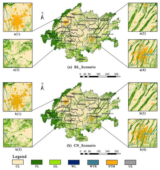 As shown in Figure 3, the land use spatial distribution of the CCUA in 2030 under the two scenarios showed similar characteristics. Among them, Chengdu and Chongqing are still the concentrated distribution areas of STM. FL is mainly distributed in the western part of the CCUA with Mianyang, Deyang, Chengdu, Ya’an, and Leshan, and in the eastern part of the CCUA with Dezhou, Guang’an, Chongqing, and Luzhou. GL is widely distributed in the CCUA, especially in Chongqing, Leshan, Yibin, and Luzhou. CL is still the most prominent land use type in the CCUA, widely distributed in space. Although the area of WL and WTR is relatively small, they are distributed in all counties and urban regions. Among them, the Yangtze River, Jialing River, Minjiang River, and Dadu River in the central and western CCUA connect the WTR systems together.