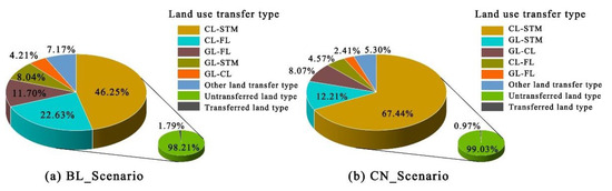 However, in the view of land use transfer type and land use dynamic degree (LUDD), the two scenarios show apparent differences. From a land use transfer type perspective (Figure 4), a total of 1.79% (3349.3338 Km2) of land types were transferred in the CCUA from 2020 to 2030 under the BL_Scenario, among which the area of CL to STM was the largest (1549.0341 Km2), accounting for 46.25% of the total area of land types transferred. The transformation of CL to the FL was second (757.9488 Km2), accounting for 22.63% of the total area of transferred land, indicating that the transformation of CL to STM and FL was the primary type of LUCC in the CCUA under the BL_Scenario. However, under the CN_Scenario, 0.97% (1806.7429 Km2) of land types were transferred in the CCUA from 2020 to 2030, and the area of CL to STM was the largest (1218.4489 Km2), accounting for 67.44% of the total area of land types transferred. GL transferred to STM was second (220.5902 Km2), accounting for 12.21% of the total land transfer area. Therefore, the transformation of CL to STM was the primary type of LUCC in the CCUA under the CN_Scenario.