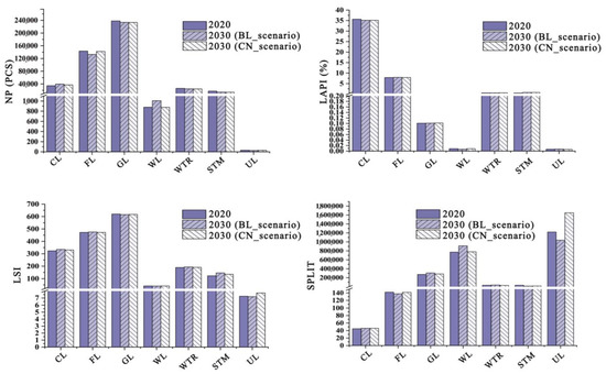 The study of landscape patterns is conducive to the study of its dynamic process of change, revealing the mutual influence relationship of the LUCC, and putting forward suggestions for the sustainable development of land use [66,67]. Therefore, this study used landscape pattern analysis to calculate the LPI, and compared and evaluated the ecological benefits of land use spatial distribution under the CN_Scenario and BL_Scenario in 2030.